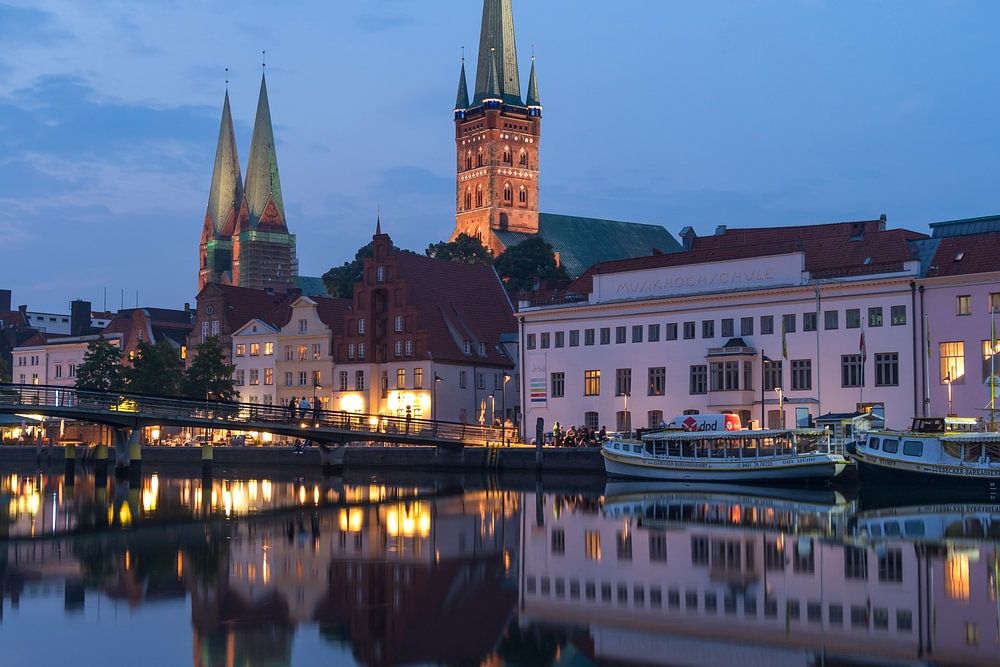 Old town and river Trave at dusk, Lübeck, Schleswig-Holstein, Germany | old town and river Trave at dusk, Lübeck, Schleswig-Holstein, Germany