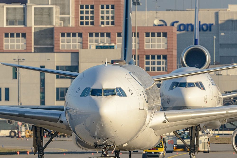 Lufthansa Airbus A340 and Lufthansa MD-11. Two Lufthansa aircraft, an Airbus A340-300 in Star Alliance livery and an MD-11 cargo plane, are towed to their parking area at Frankfurt am Main airport. Registration A340: D-AIFA. Registration MD-11: D-ALCM. This photo was taken on 27 February 2016.