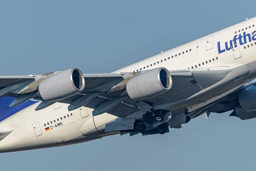 Lufthansa Airbus A380 "Deutschland" (D-AIMN). Lufthansa Airbus A380 (D-AIMN) named "Deutschland" took off from the airport near Frankfurt am Main. This photo was taken on 27 February 2016.