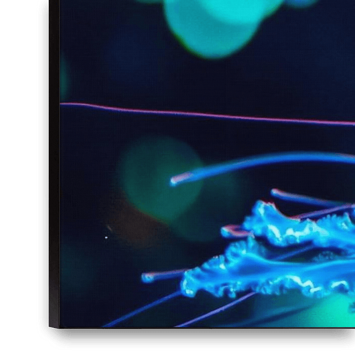 A radiant spectacle of glowing colours and gentle movements unfolds in an aquatic dream. The shimmering jellyfish floats through a sea of sparkling blue and golden lights. Perfect for the living room, it brings a touch of calm and extravagance to any room in need of a vibrant accent.