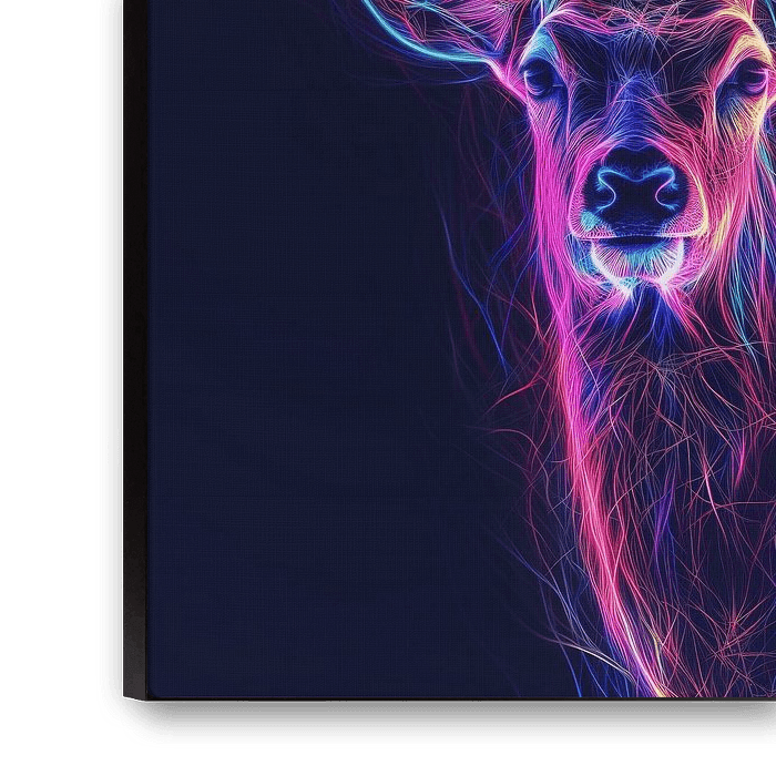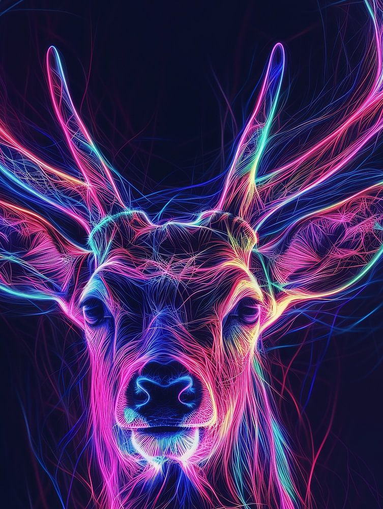 The picture shows a colourful, neon-like portrait of a stag against a dark background. The lines and contours of the stag are depicted in bright neon colours of blue and pink, giving it a vibrant and dynamic feel. The fine lines and glow are reminiscent of St Elm's fire, as seen during thunderstorms. St Elm's fire is a light phenomenon caused by electrical charges in the atmosphere. It glows blue-violet on sharp objects. The stag has majestic antlers, which are also highlighted in bright colours. The picture creates a contrast between the natural shape of the stag and the artificial glow. It conveys a mood of elegance, mysticism and magic. Bring some magic into your living room with this poster.