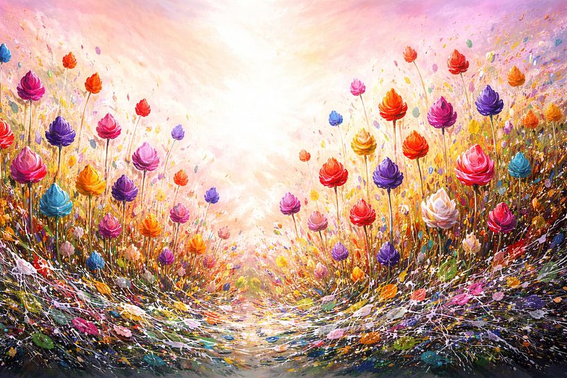 This flower series was created as an abstract, expressive interpretation of a field of flowers. Instead of a realistic depiction, the focus is on colour, movement and emotion. The individual blossoms are deliberately simplified and almost sculptural, while the background consists of dynamic, sometimes wild colour structures.