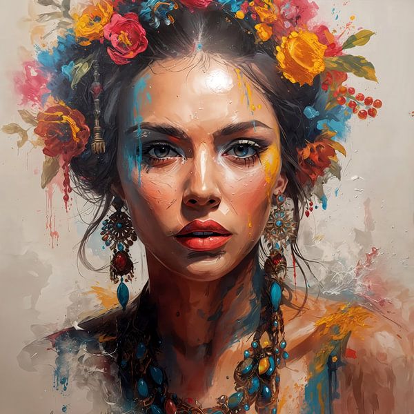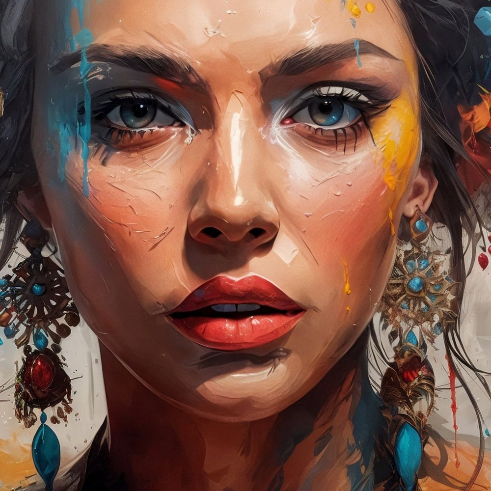 This is an abstract expressionist-style painting featuring a close-up portrait of a woman with a serene yet intense expression. The woman's face is the focal point, rendered with delicate, precise brushstrokes that contrast with the chaotic, vivid background. The overall effect is both striking and mesmerising, with the abstract…