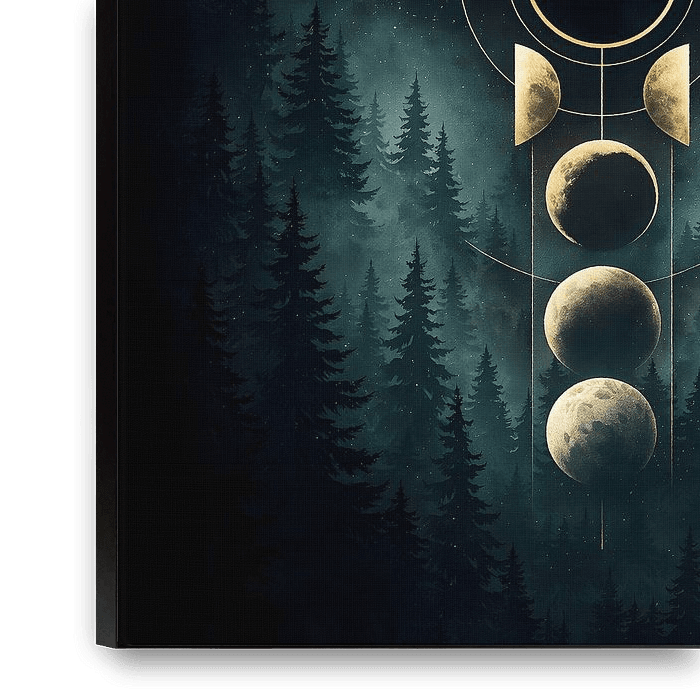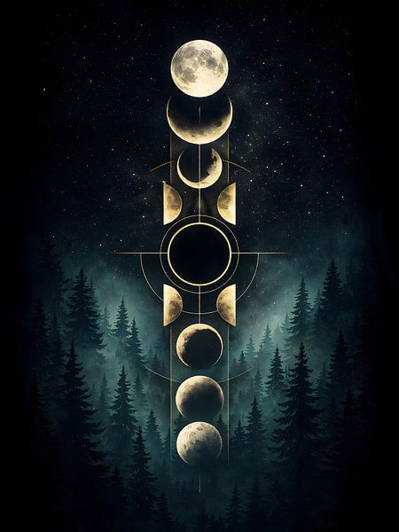 Discover the mystical connection between the moon and the earth with this evocative celestial landscape. The artwork depicts the complete cycle of lunar phases arranged in a vertical symmetrical alignment, from the sliver of a crescent to the brilliance of a full moon. These golden celestial bodies are set against a backdrop of a dense,…