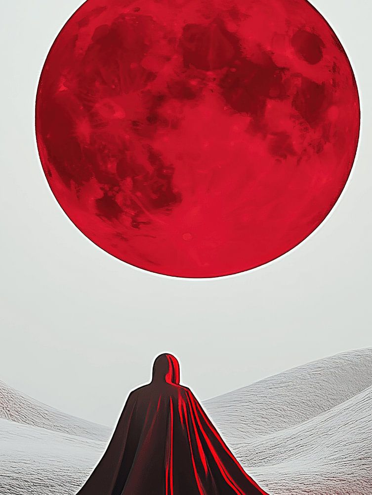 A lone figure draped in red sits quietly amidst the soft, snow-like dunes, gazing at a striking crimson moon hanging in the pale sky. The image exudes an air of serenity and mystery, with the contrast between the white landscape and the intense red elements symbolizing isolation, contemplation, and cosmic awe. The simple, minimalistic composition captures the beauty of solitude under the grandeur of the universe.