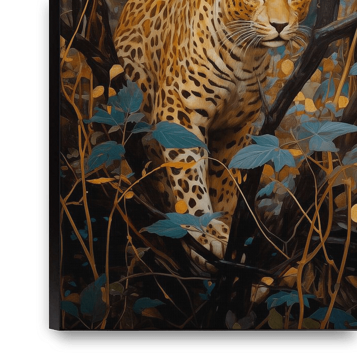 A colourful digital painting of a leopard in the jungle. The work gives a warm and rustic look to your interior!