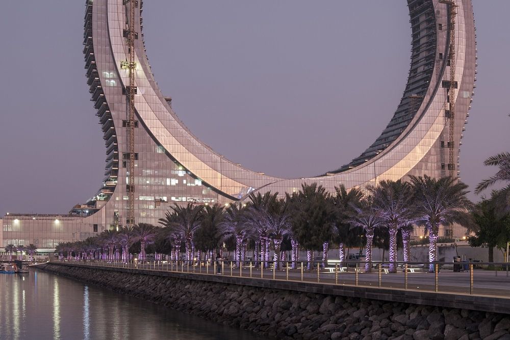 About "Lusail Corniche in Lusail City, Qatar at the marina sunset shot"