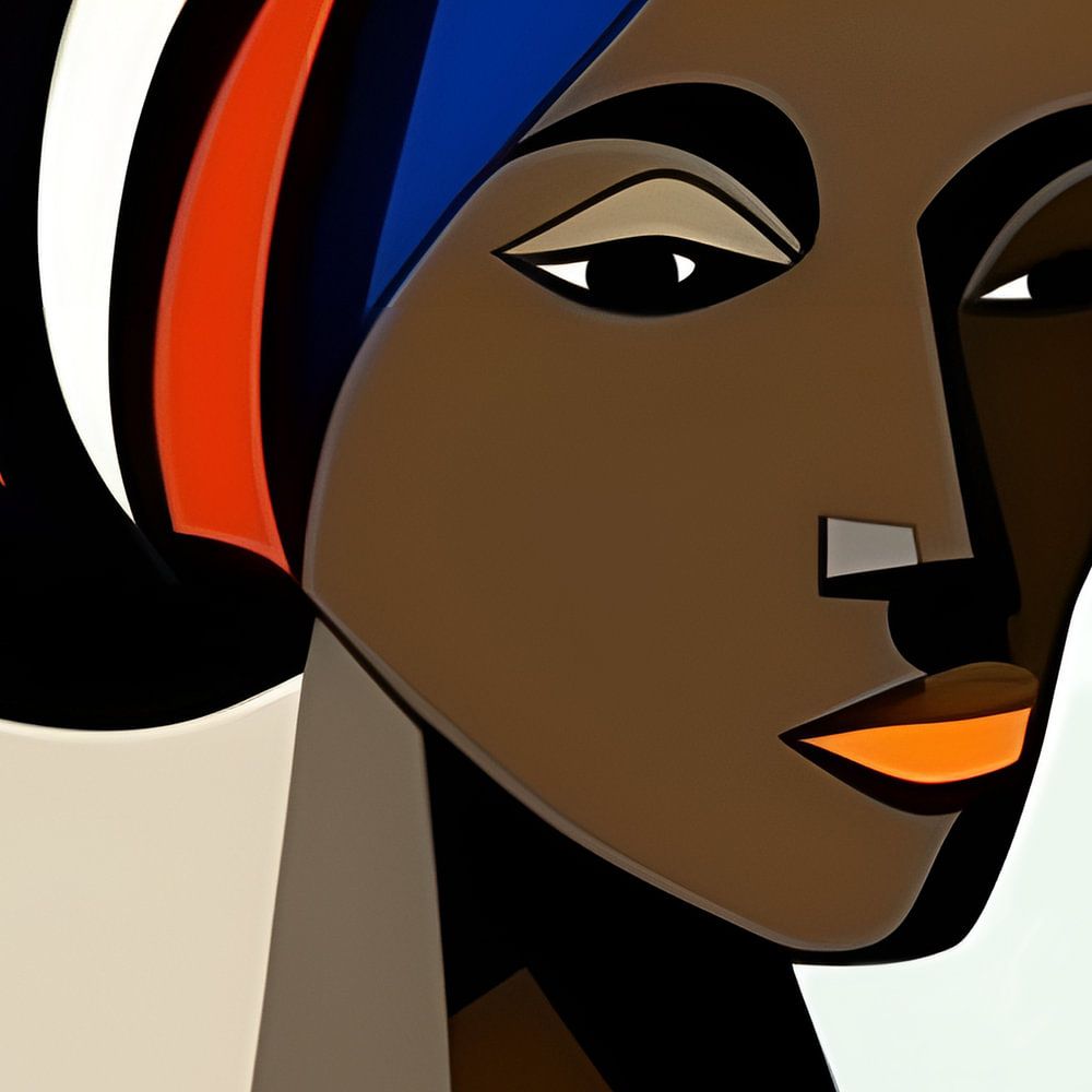 The woman's contours are formed by sharp, geometric lines that reflect her grace and strength. Her face is made up of facets, an interplay of triangles and rectangles that symbolise the diversity and depth of her personality. The colours are vibrant and rich, inspired by the vibrant energy of Lagos, with warm reds, deep blues and vibrant oranges coming together in a harmonious dance.