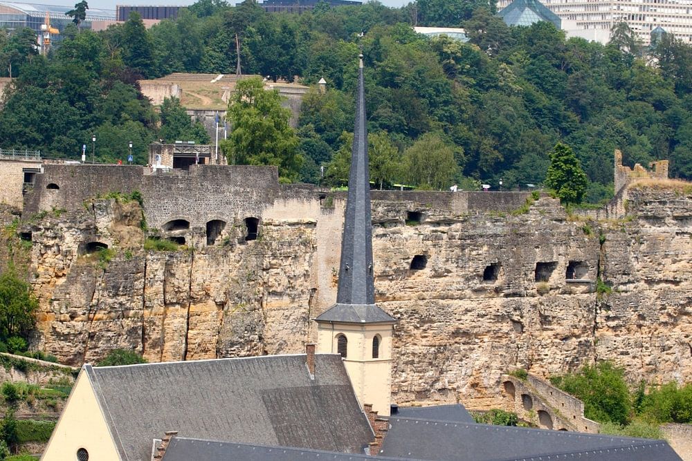 Houses, Neumünster Abbey, church, monastery, cultural center, lower town Grund, behind it the skyscrapers of the Kirchberg Plateau , Luxembourg City, Luxembourg, Europe