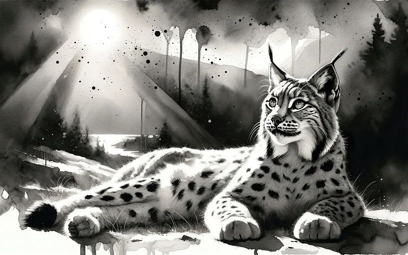 A lynx rests in sunlight across a quiet mountain landscape, shown reclining with its body stretched out and its head lifted toward the light. The spotted coat is rendered in soft grayscale washes, with bright highlights defining the face, chest, and powerful paws. Fine whiskers and tufted ears sharpen the expression, while the dark tail…