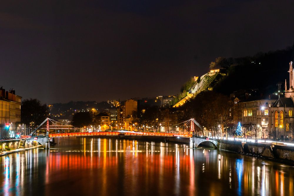 View over the Saone in Lyon, France, overlooking both sides of the city at night