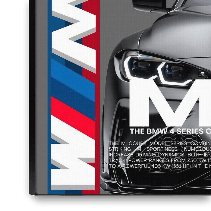 The image showcases a collage of a sleek, silver BMW M4 Coupe. The car is presented in various angles, highlighting its sporty design and powerful features. The front view reveals the signature BMW grille, sharp headlights, and aggressive bumper. The rear view displays the distinctive taillights, a spoiler, and the iconic BMW M badge.