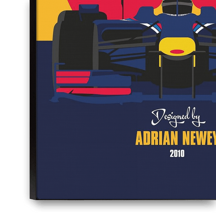 A stylised graphic of Sebastian Vettel's Red Bull Racing RB6 Formula 1 car dominates the foreground against a against a striking red and yellow background. The F1 car design is attributed to Adrian…