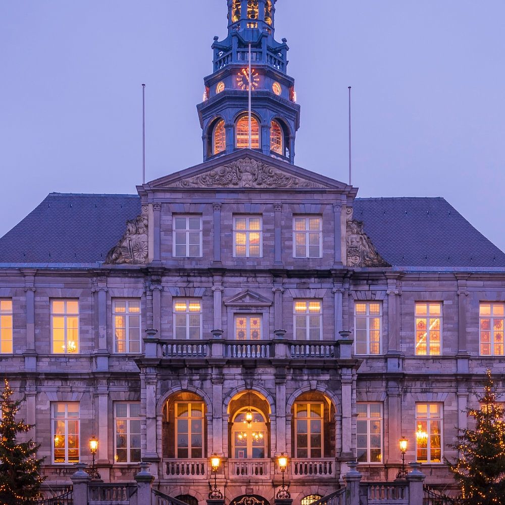 Maastricht's historic Town Hall, captured at dusk as the lights bring the monumental building to life. The warm light contrasts beautifully with the blue evening sky, highlighting the classic architecture and details of this iconic building on the Markt square.