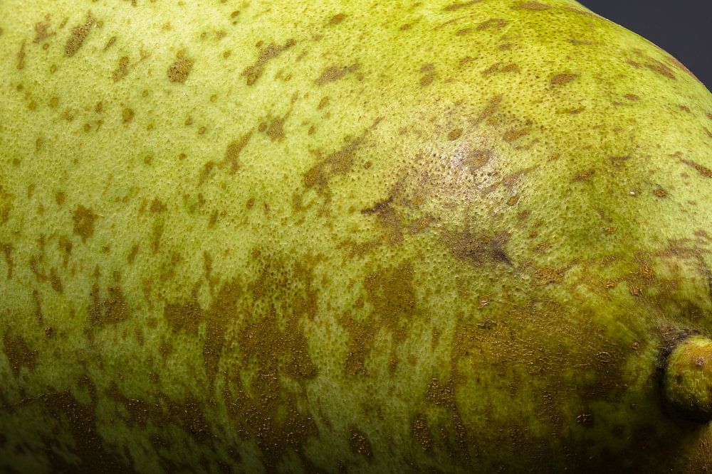 Studio macro shot of a green Williams pear against a dark background (macro stacking)