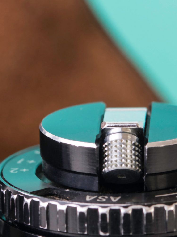 Colourful detail of part of a vintage 'Praktica' camera on turquoise background.