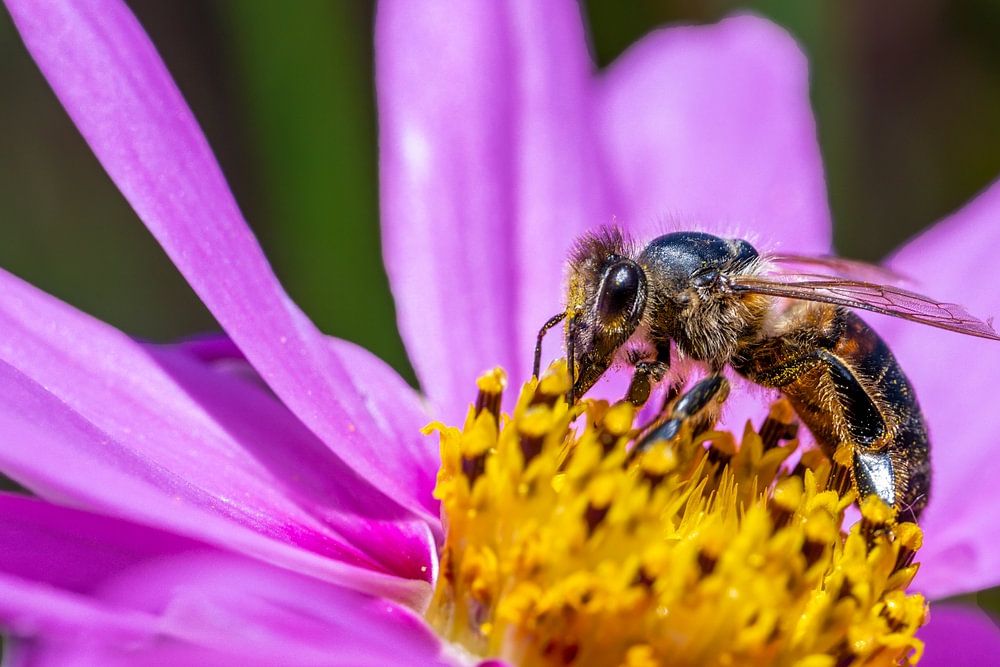 About "Macro of a bee on a pink dahlia flower"