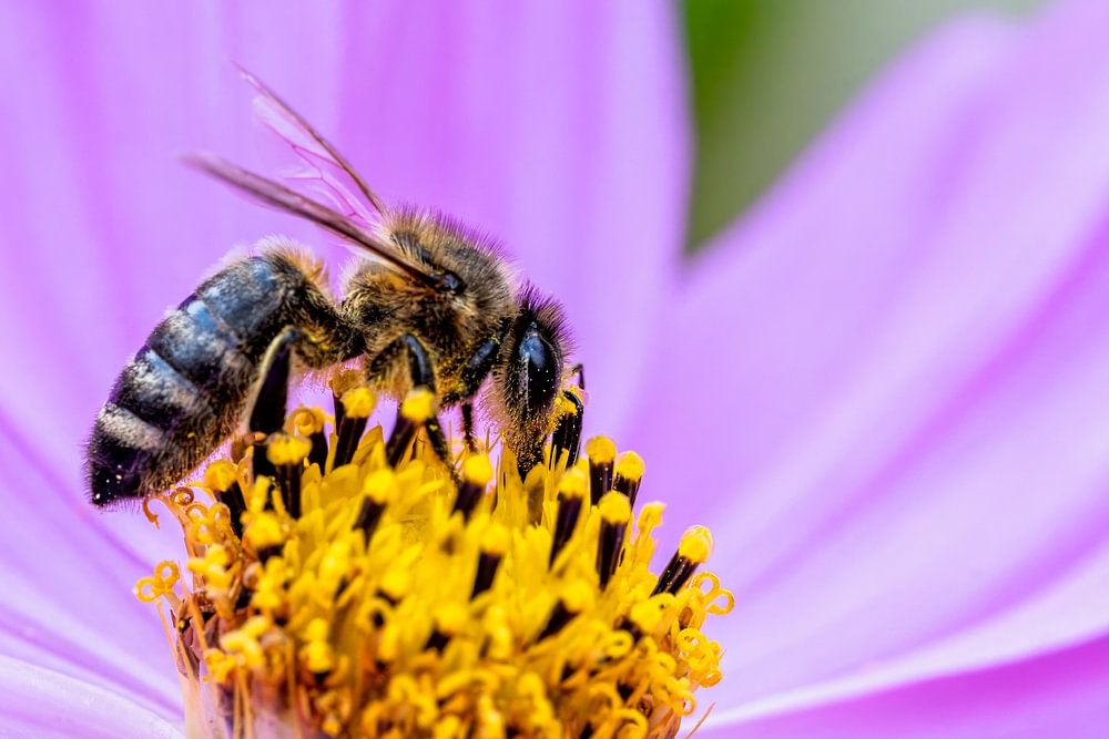 Macro of a bee on a pink dahlia flower by ManfredFotos