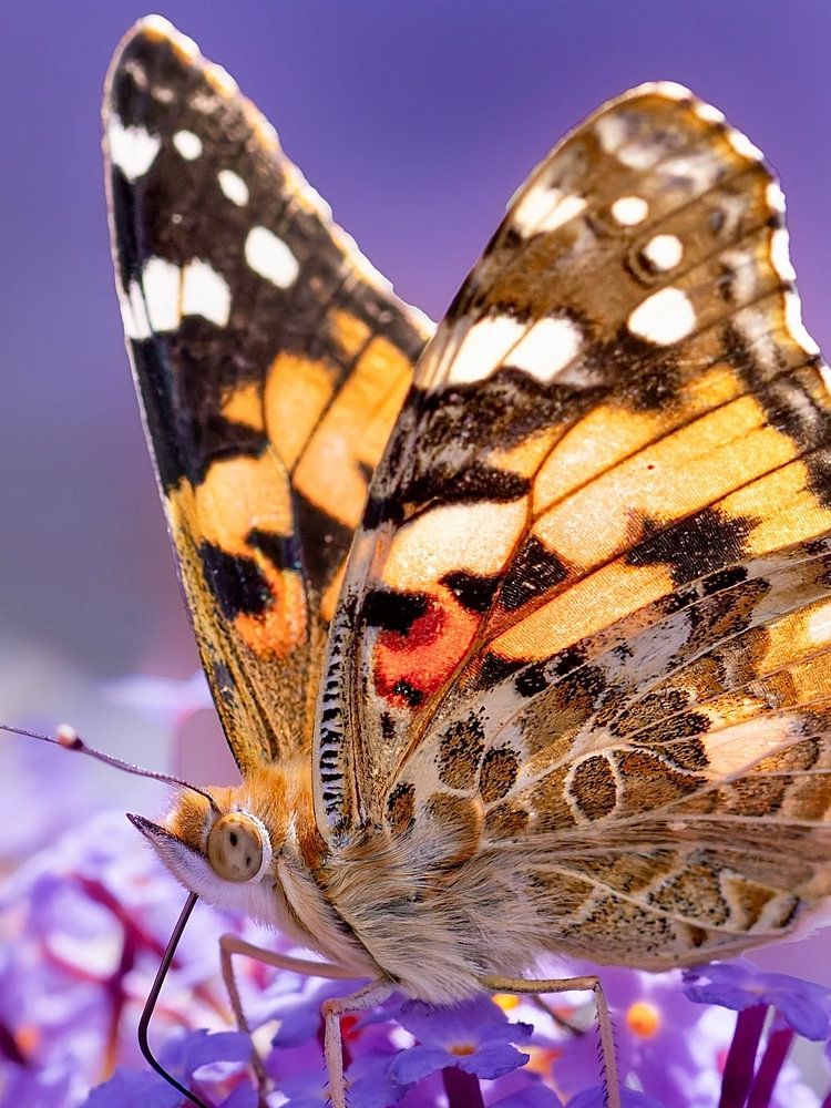 This stunning macro shot shows a thistle butterfly in all its refined beauty, with wings full of warm shades of orange and brown, subtly framed by a soft purple background. The harmonious colour combination makes this photo a soothing yet vibrant eye-catcher in any interior.
