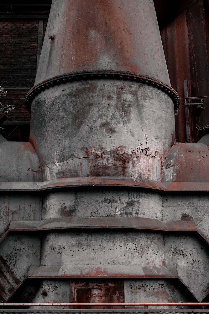 Industrial romance in the heart of the Ruhr region - This picture shows a monumental steel structure in the Duisburg-Nord Landscape Park. The weathered surface, covered in rust and time, tells stories of past industrial power. In contrast to the geometric rigour of the construction is the quiet, almost meditative atmosphere of the place. The subdued light and cool colour tones lend the scene a smoky melancholy that captures the charm of abandoned industrial plants and at the same time pays tribute to their quiet grandeur.