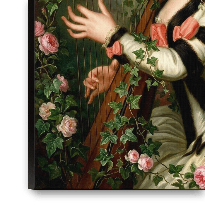The lush, flowery setting with ivy and roses, combined with the serene expression of the woman playing the harp,…