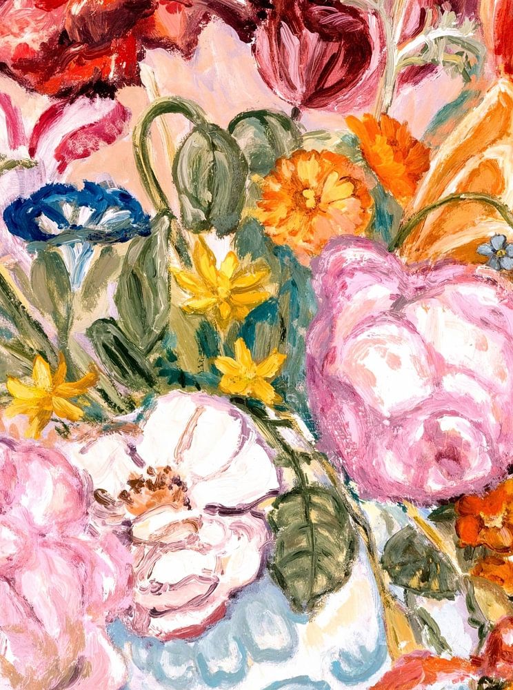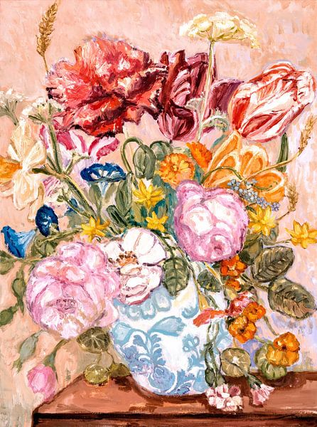 This original design and painting, by Dutch painter Tanja Koelemij, was inspired by 17th-century flower still lifes. In particular, on the paintings by the painters Rachel Ruysch, Jan Davidsz de Heem and Jacob van Walscapelle. "Magenta Bloom" is made with a quick touch in a loose, sketch-like manner.