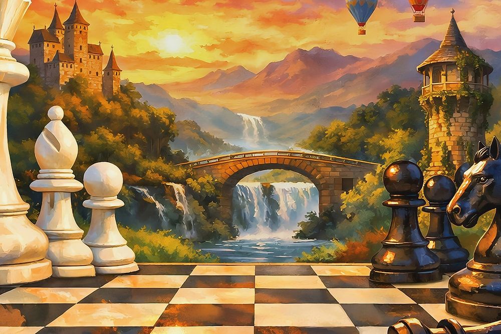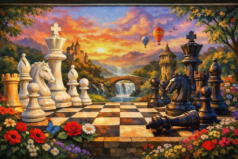 In "Magic Chessboard", the chessboard becomes a place where strategy and transformation converge. The fallen black king marks a turning point in the game. The evening light and the surrounding nature - flowers, butterflies and hot-air balloons - contrast the human competition and raise the question of what remains after the game.
