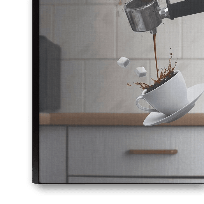 The floating coffee beans, jets of milk and steaming coffee evoke a sense of cosiness and familiarity, as if you were preparing your favourite cup of coffee in your own kitchen. This picture captures the essence of enjoying coffee at home, with a touch of magic that transforms the everyday.