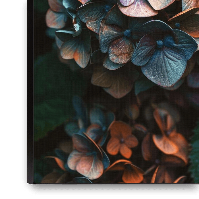 This trendy artwork shows a luxurious collection of hydrangea flowers bathed in the glow of dim light.