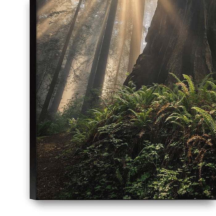 Beautiful sun harps shine through the huge Redwoods in California.