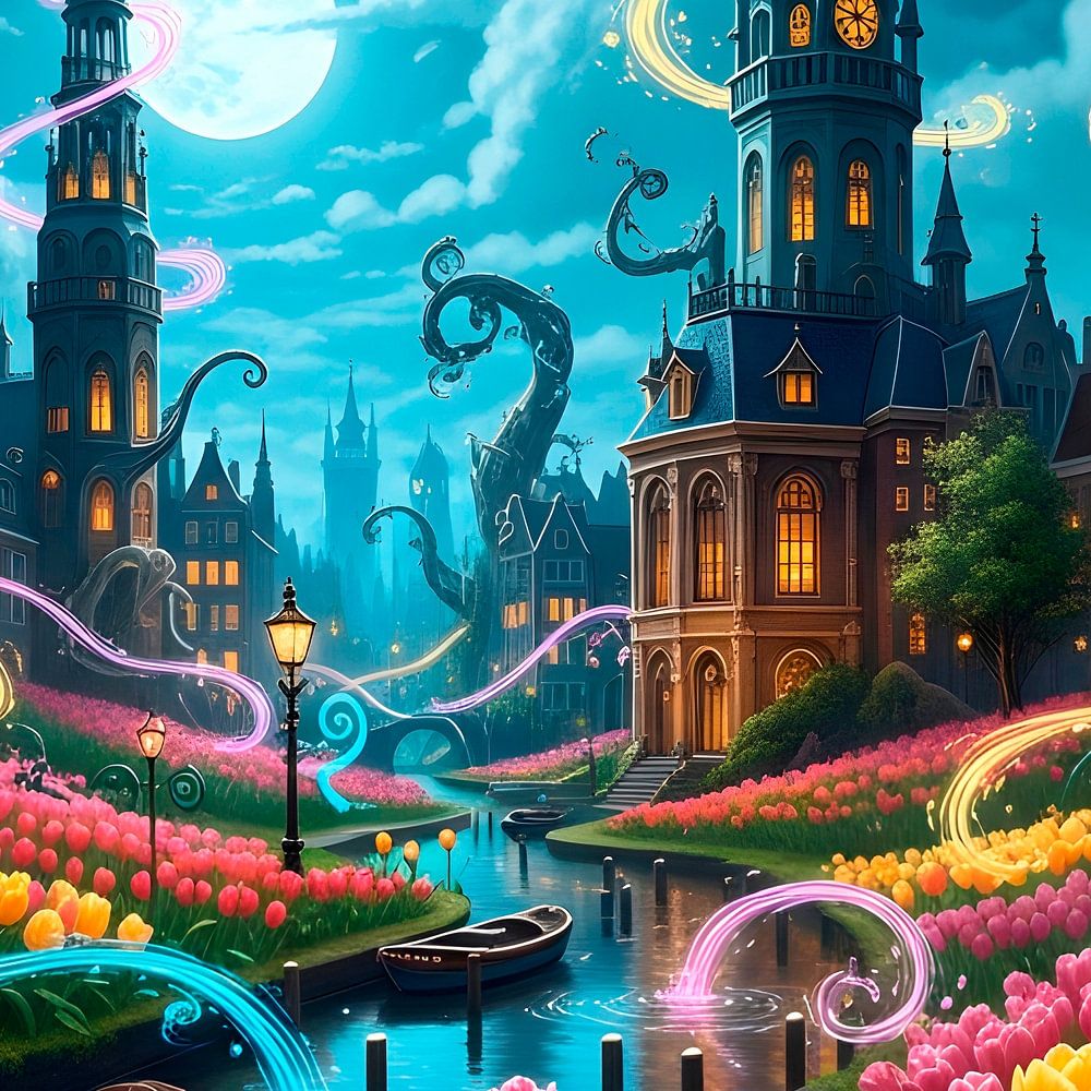 This artwork transports viewers to a magical city beneath the luminous blue moon. Brilliant flowers line water channels, with whimsical architecture and lush trees creating a fantasy landscape that feels alive. The scene blends dreamy colors and enchanting details to spark curiosity and joy. Inspired by the beauty of futuristic gardens and the wonder of moonlit nights, this piece invites reflection on harmony between nature and imagination. Hidden elements reward close observation. Displayed anywhere, it brings playfulness, tranquility, and inspiration through its captivating fusion of fantasy and serenity.