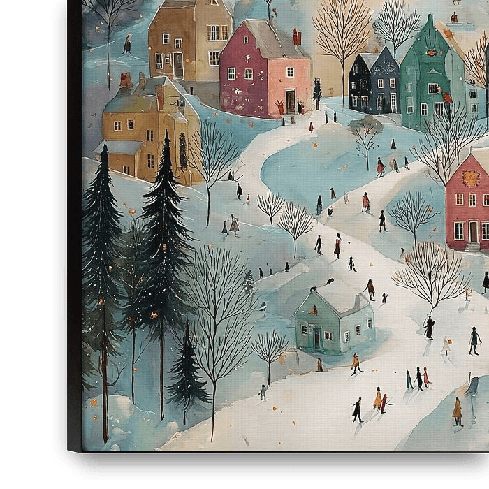 An enchanting winter scene of a picturesque village where warm, colorful houses are scattered across snow-capped hills. A majestic Christmas tree stands at the heart of the composition, while golden stars dance like magical lanterns in the turquoise night sky. Snowy paths meander throughout the village, on which small figures move,…