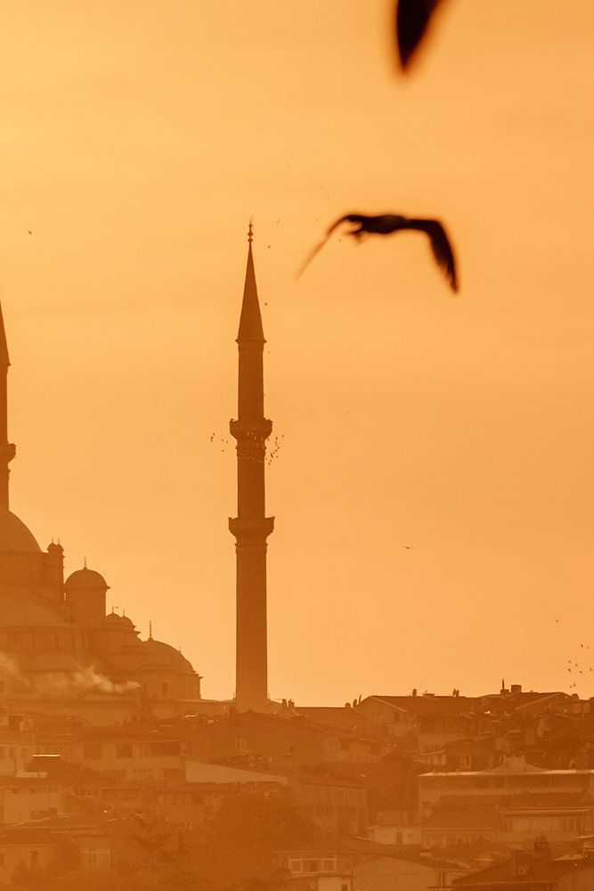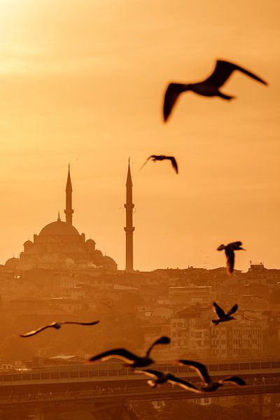 Istanbul during sunset is an experience like no other. As the sky fills with warm hues, golden and orange colours seem to spread across the Bosphorus and envelop the city. Seagulls soar through the air, their silhouettes sharply outlined against the glow of the setting sun. In the background, Istanbul's impressive skyline with a huge mosque looms majestically and serenely. Its minarets tower high above the city, a timeless reminder of the rich history and culture of this ancient metropolis.