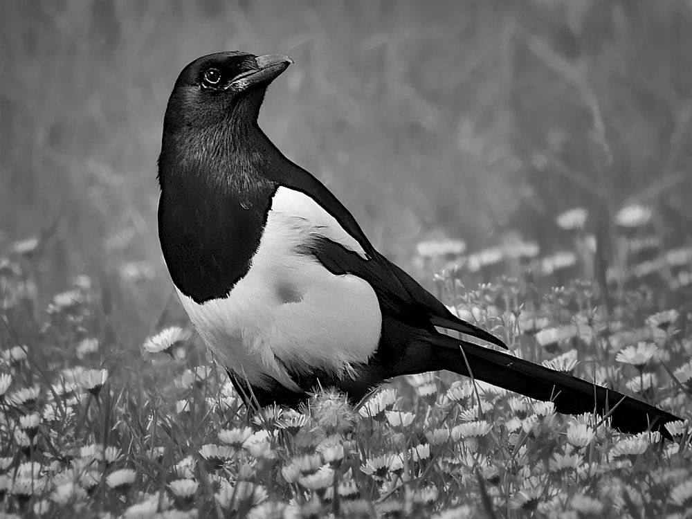 The magpie in a sea of daisies on nature reserve De Gavers in Harelbeke.