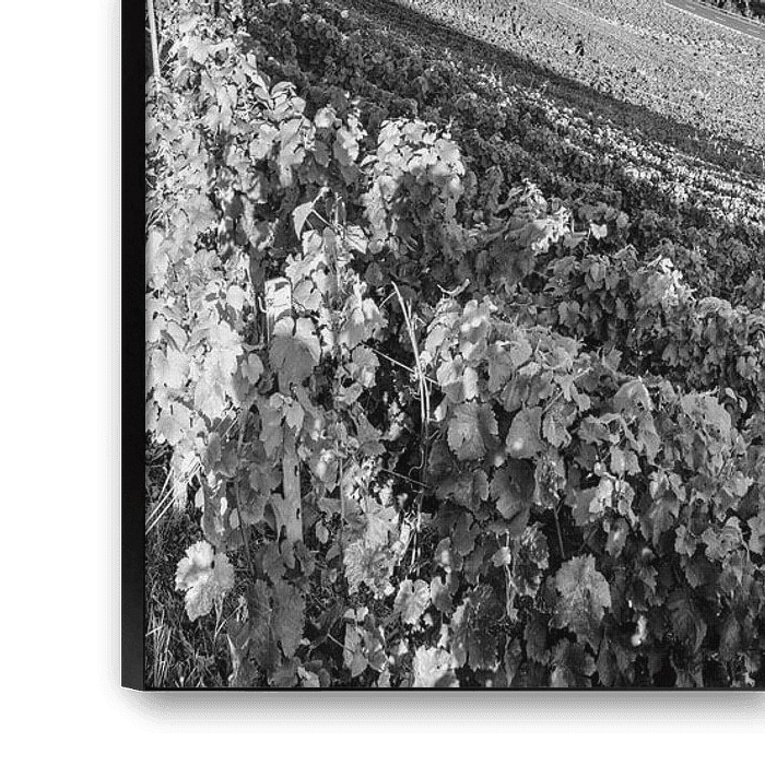 Vineyard with grapevines on the Main / Maindreieck in the wine-growing region of Franconia in Lower Franconia in black and white