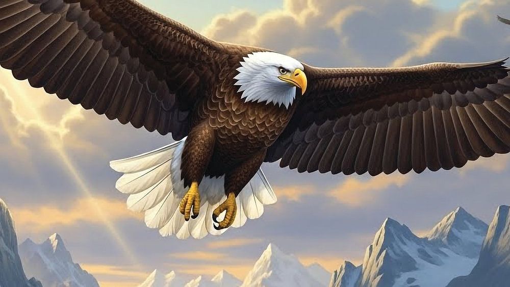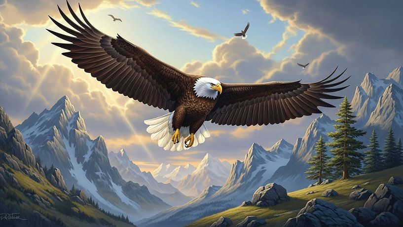 This powerful artwork depicts a majestic bald eagle soaring high above dramatic mountain peaks, symbolizing freedom, strength, and vision. With its wings fully spread, the eagle dominates the sky while soft sunlight breaks through the clouds, illuminating the rugged landscape below. The combination of towering mountains, open skies, and…