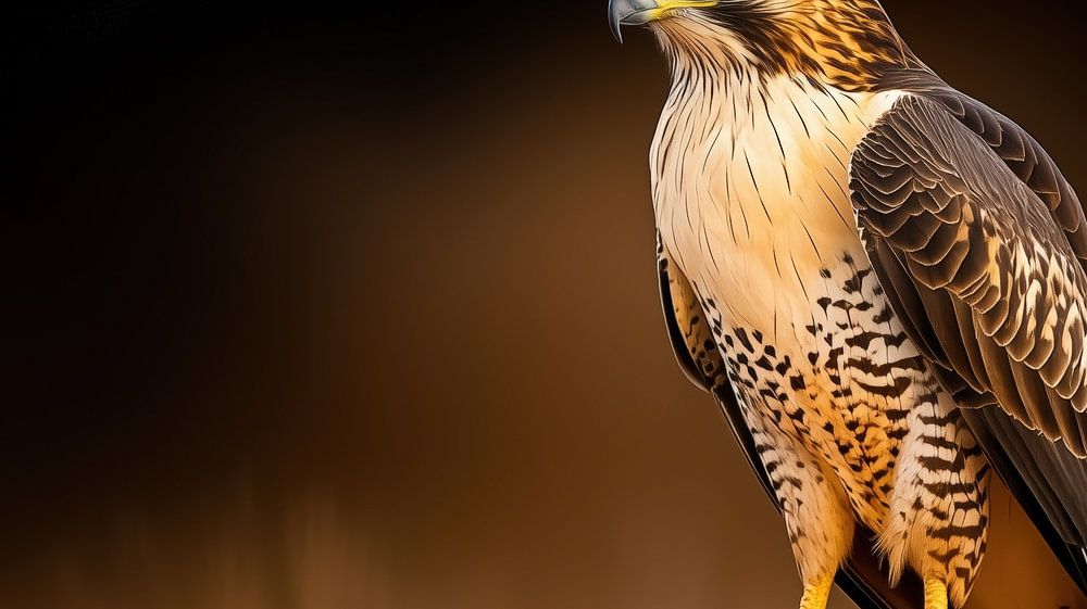 The dark background creates a sense of depth and mystery, allowing the hawk to stand out as the focal point of the composition. The soft lighting casts subtle shadows, adding to the overall moodiness of the scene while highlighting the texture of both the bird’s feathers and the hay. This illustration perfectly captures the essence of nature and wildlife, portraying the hawk as a symbol of power, precision, and the rugged beauty of the natural world.