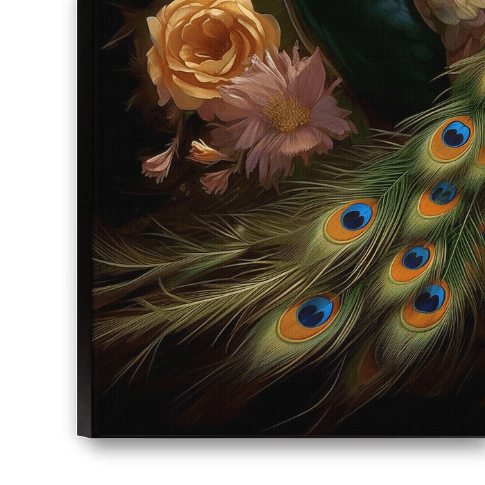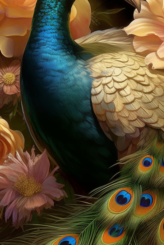 This artful image captures the essence of elegance and sophistication by depicting a peacock with its spectacular plumage flanked by large, softly coloured flowers. The peacock, with its richly hued, iridescent feathers in shades of blue and gold, symbolises beauty, pride and immortality. The combination of lush flowers and the rich colour palette creates an image that comes across as both romantic and powerful. The peacock exudes a mystical serenity, and the use of lighting effects enhances the sense of depth and texture, making the peacock seem almost to come alive.
