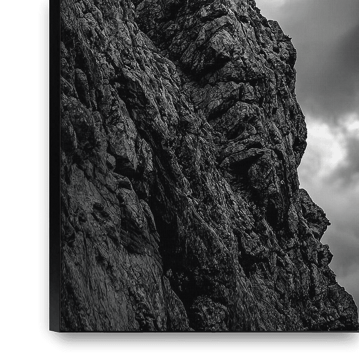 A majestic mountain goat sits proudly enthroned on a dramatic rock. Its impressive horns reach for the sky, while the gloomy clouds around it create a mystical atmosphere. In this monochrome interplay of light and shadow, the untamable wildness of nature is revealed in its purest form. A truly poignant image of strength and freedom.