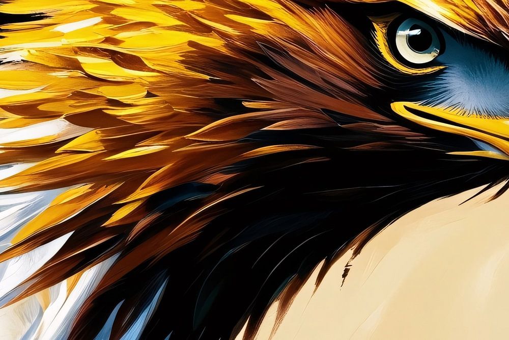 This modern design of an eagle exudes power and energy. The use of vibrant colours such as yellow, blue, green and white, combined with the dynamic brush strokes, brings the eagle to life. Perfect for lovers of nature and animal art, this artwork adds a striking and inspiring element to any room. The eagle's detailed feathers and intense gaze make the design expressive and full of character, ideal for hanging as a statement piece in a living room or office. This digital art is not only a tribute to the eagle, but also a modern interpretation that feels both abstract and realistic.