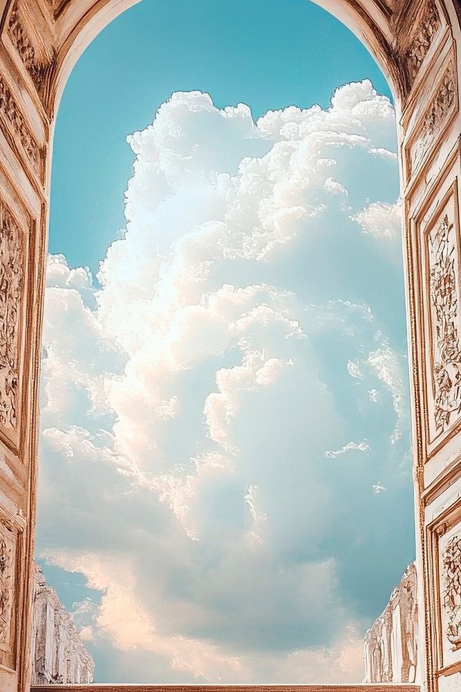 A majestic gateway, framed by ornate decorations, opens up to a bright blue sky adorned with gentle clouds. This inspiring view conveys a sense of freedom and discovery. Ideal for the living room, it creates an inviting atmosphere and stimulates the imagination of visitors.