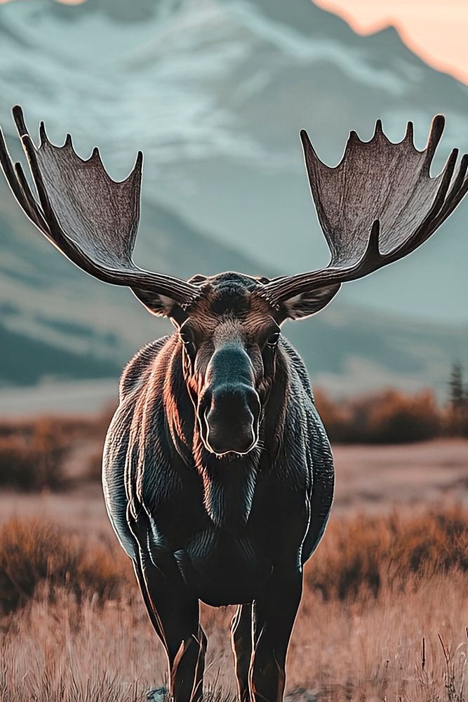 With its majestic face and impressive antlers, the animal rises up against the sublime mountain landscape. The gentle hills and snow-covered peaks frame the mysterious moment, while the golden light of the sunset lends the scenery its splendour. An image of wilderness that combines strength and grace in perfect harmony.