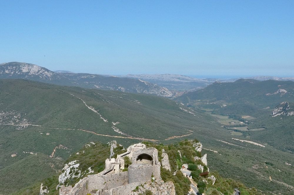 From the heights of Château de Peyrepertuse, a spectacular panorama stretches across the valley, offering uninterrupted views of the mountains and lush green landscapes of the Occitanie region. The tranquillity and grandeur of this unique setting invite you to contemplate.