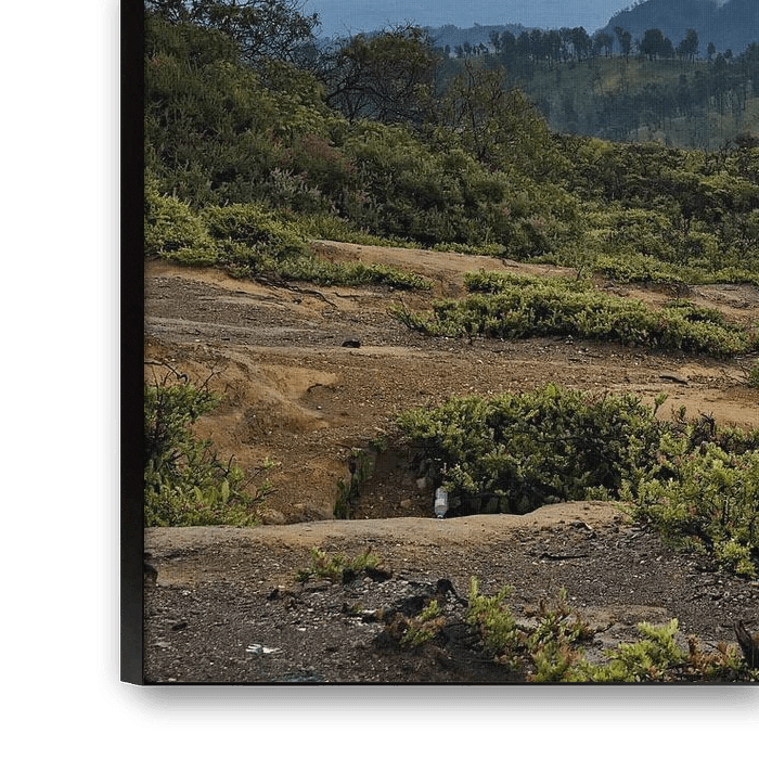 This image captures one of the grandiose landscapes visible at altitude around Kawah Ijen, on the island of Java in Indonesia. In the foreground, the volcanic terrain appears barren and uneven: ochre earth, twisted roots and a few fire-burnt stems, evidence of past fires, can be made out. Despite these scorch marks, low, dense vegetation persists, clinging to the rocks and spreading gently down the slopes. It adds a touch of bright green that contrasts subtly with the parched ground. On the horizon, the terrain is divided into several levels: hills, ridges and volcanic domes, covered by sparse forests. A small sheet of mist floats just above a secondary summit, creating a mysterious atmosphere. Finally, the sky occupies a large part of the composition; it is vast, light blue, dotted with white clouds of varying shapes, as if suspended above the immensity of the high altitude landscape. The whole evokes the brute force of the volcano, but also the resilience of nature, which continues to be reborn after the burns and sulphurous fumes.