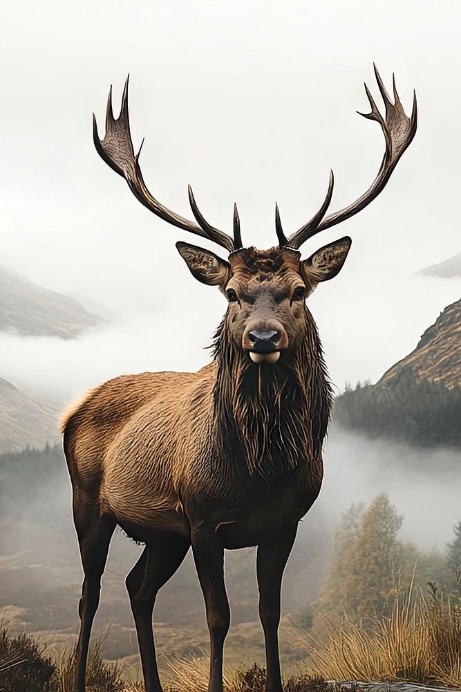 A majestic stag sits enthroned in the middle of a moss-covered landscape, its imposing antlers proudly reaching towards the sky. The mystical mist gently envelops the mountains, while the soft earthy tones of nature create a tranquil atmosphere. This fascinating creature seems to be at one with the wilderness, a symbol of freedom and strength in an unspoilt world.