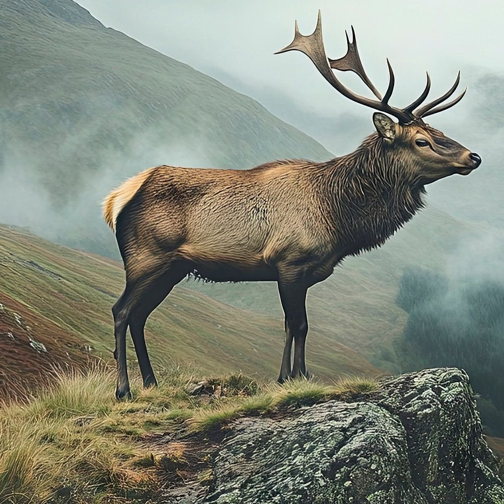 The majestic stag stands proudly on its rock, surrounded by misty mountains. Its magnificent, branched antlers seem to pierce the clouds as it radiates the tranquillity of unspoilt nature. The rolling hills and mysterious grey create an atmosphere of grandeur and resilience. A true symbol of the wild and untamed.