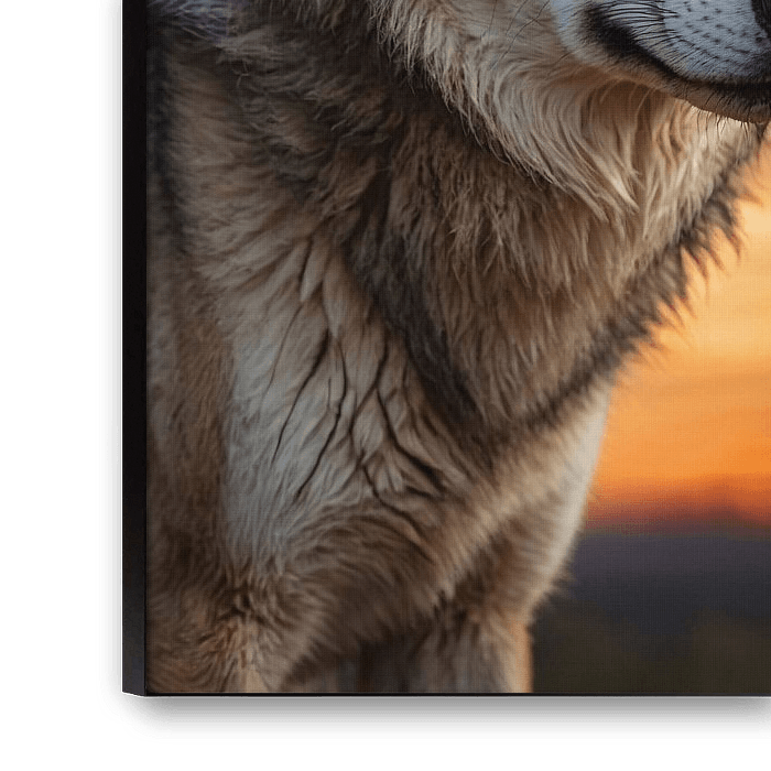This stunning image shows a majestic wolf captured against a breathtaking sunset. The wolf's details are stunningly realistic, with its rich brown and grey fur and intense, alert eyes. The warm, orange hues of the sunset create a dynamic contrast to the wolf's cool colours, giving this image a vibrant and mesmerising look. Bringing the wild beauty and serene power of nature into your home or office, this artwork is a perfect choice for animal and nature lovers. Hang this image to experience a sense of peace and admiration for nature.