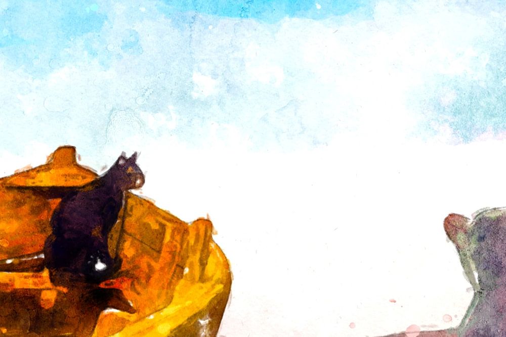 In this second part of "Making Friends" we see the meeting of a house cat and a dolphin. The house cat keeps itself dry in the wooden rowboat while the dolphin looks very curiously at the kitten.