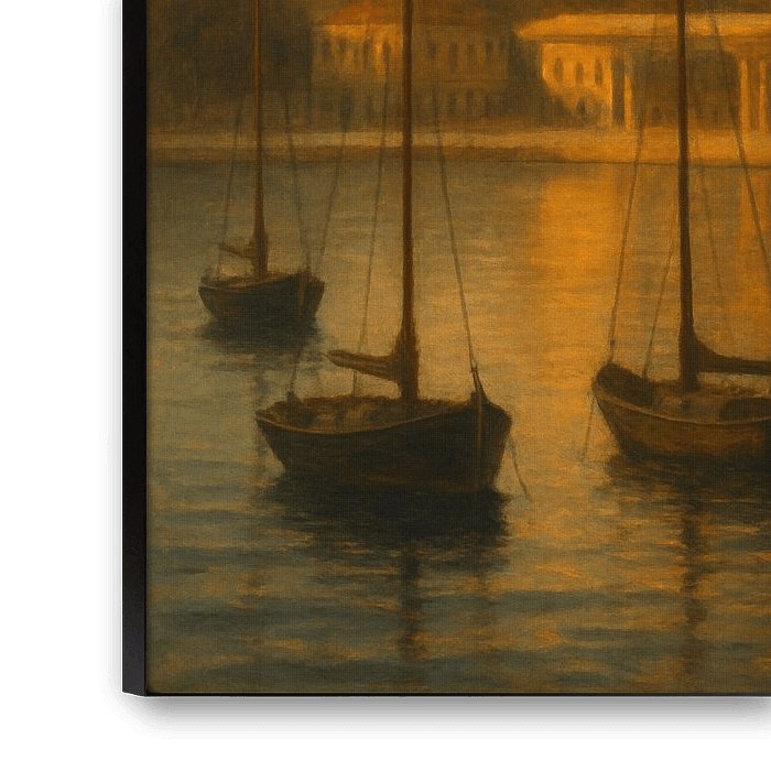 Influenced by the contemplative essence of Edward Hopper, this piece translates the vibrancy of a coastal city into quiet meditation. The harbor — often bustling — becomes a sanctuary of stillness. The gentle glow envelops every surface, and even the air seems to shimmer with calm.