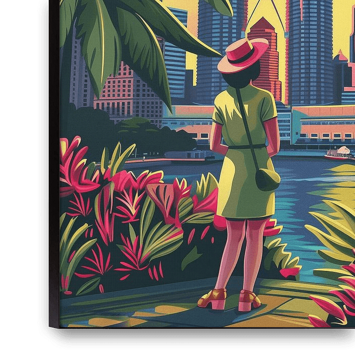 Celebrate the energy and modernity of Malaysia with this fresh, sunlit travel poster featuring Kuala Lumpur’s iconic skyline. Palm trees and tropical foliage frame the impressive Petronas Twin Towers, while a stylish figure gazes out across the shimmering cityscape. The bright sky and lush greenery highlight Malaysia’s irresistible…